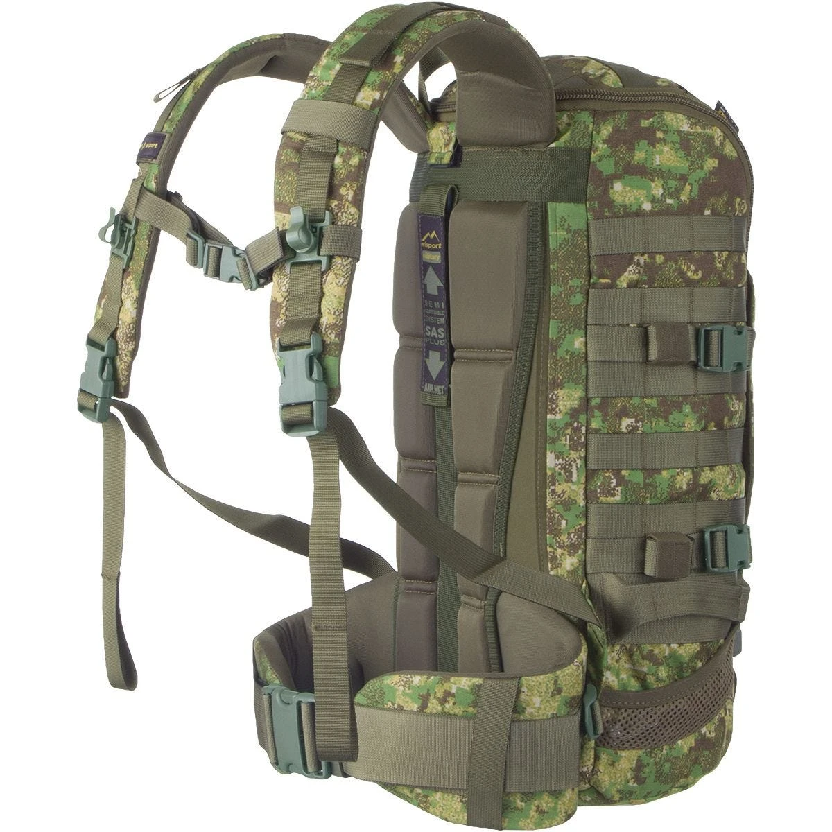 Wide and ergonomically shaped shoulder straps, together with padded waist belt help to distribute weight evenly and relief the pressure from the back. The belt can easily be detached from the rucksack which allows the use of modular weapon belts together with a tactical vest. Multiple quick-release buckles allow the backpack to be quickly dropped on the ground when required.